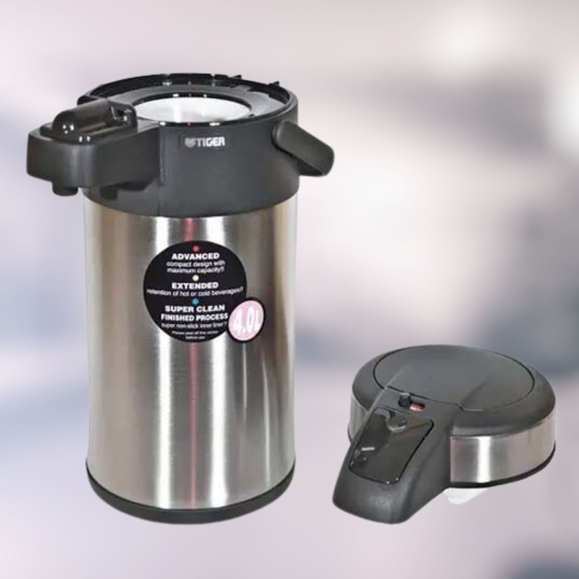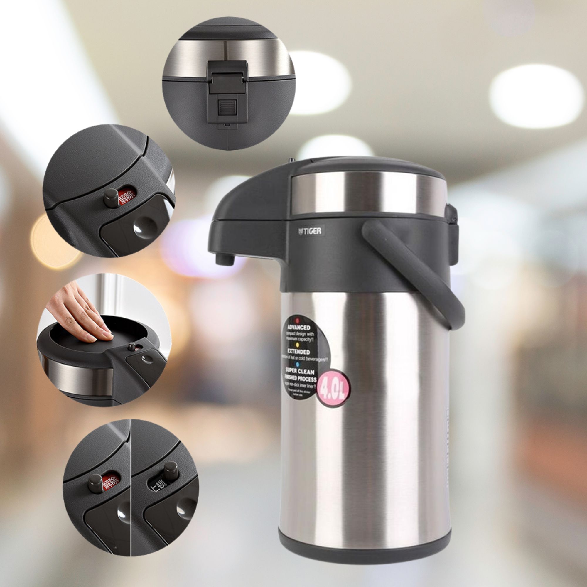 Bình thủy chứa Tiger có nắp khóa an toàn, rót nước bằng cách nhấn vào pittông trên nắp, đế xoay 360 độ giúp việc sử dụng bình trở nên an toàn hơn và giữ được hương vị của thức uống.