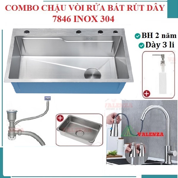 Combo chậu rửa chén bát 1 hố lớn Valenza 7846 inox sus304 chuẩn 100% kèm vòi rửa bát rút dây Valenza sus304, bộ xả to ngăn mùi, khay inox kín-TẶNG BÌNH NƯỚC RỬA CHÉN