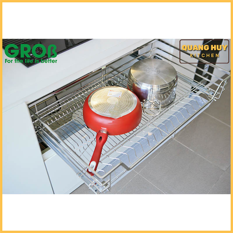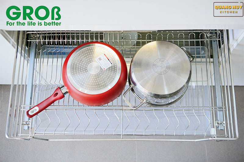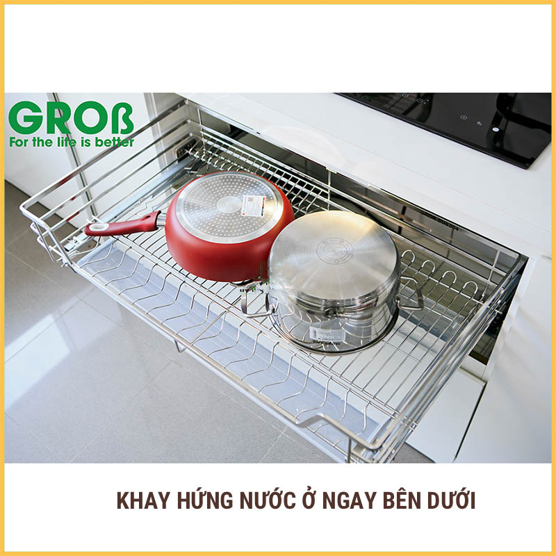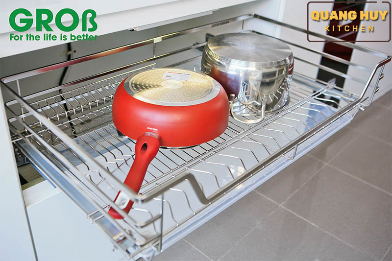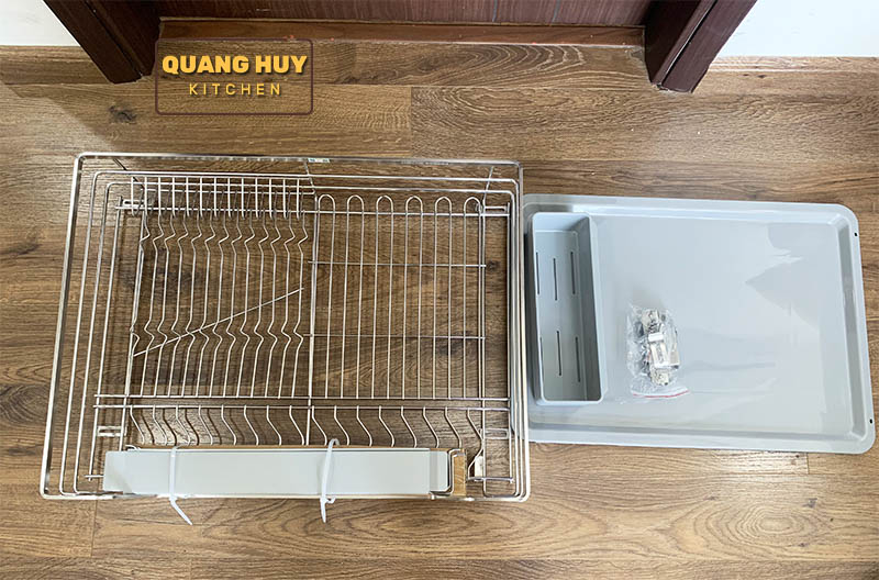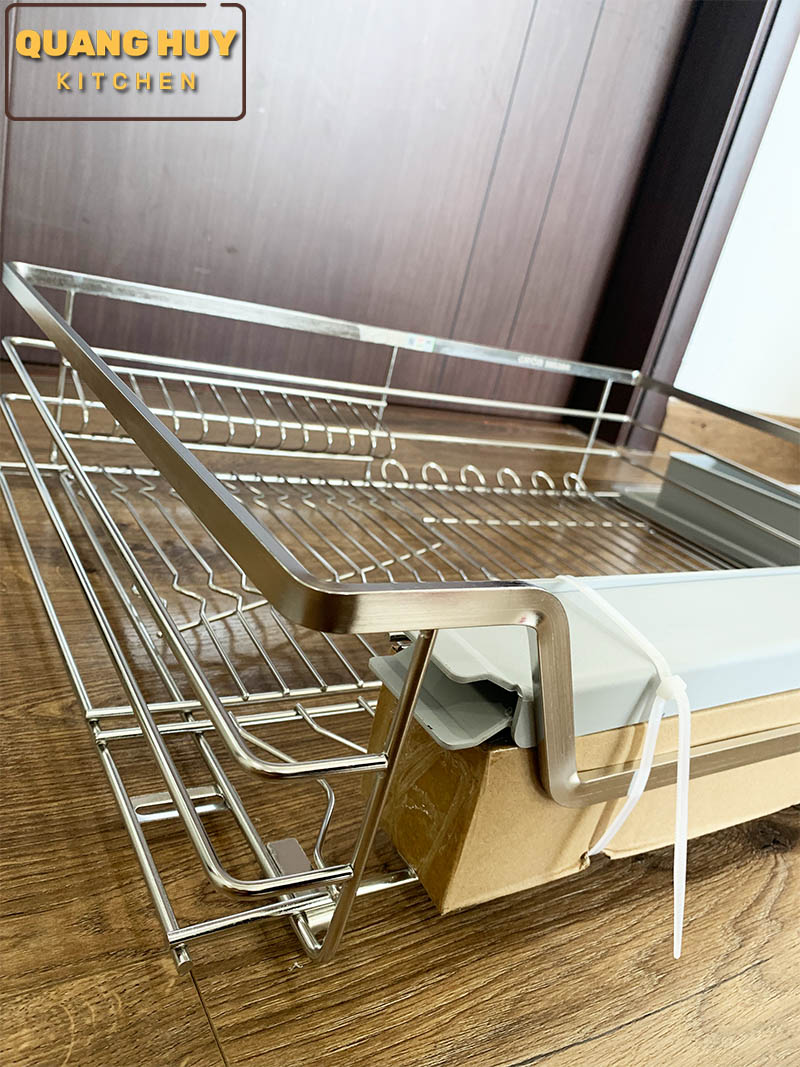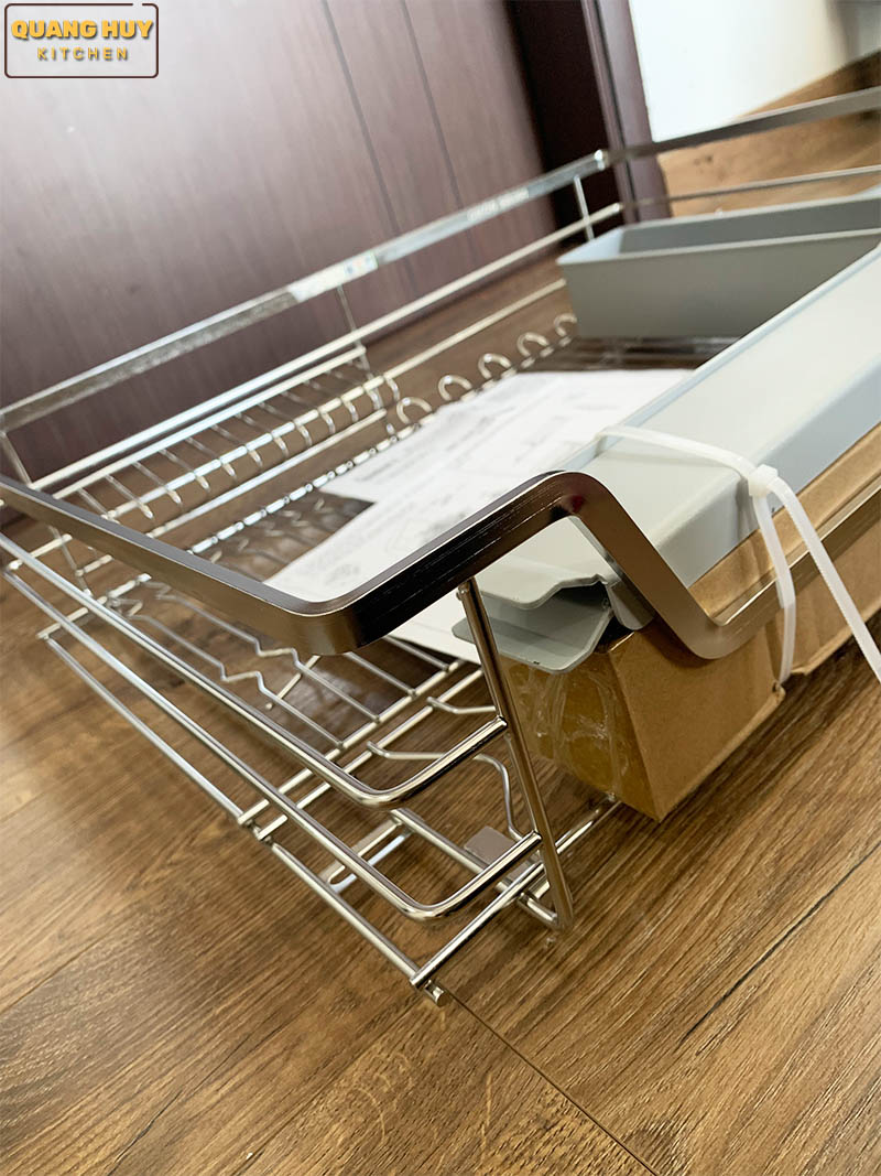 Giá úp bát đa năng tủ dưới có khay hứng nước bên dưới. Di chuyển khi kéo ray nên bạn hoàn toàn yên tâm không lo nước ra sàn. Hay như 1 số loại giá xoong nồi khay hứng nước chỉ đặt bên trong khoang tủ nên khi kéo ra ngoài làm rớt nước ra sàn