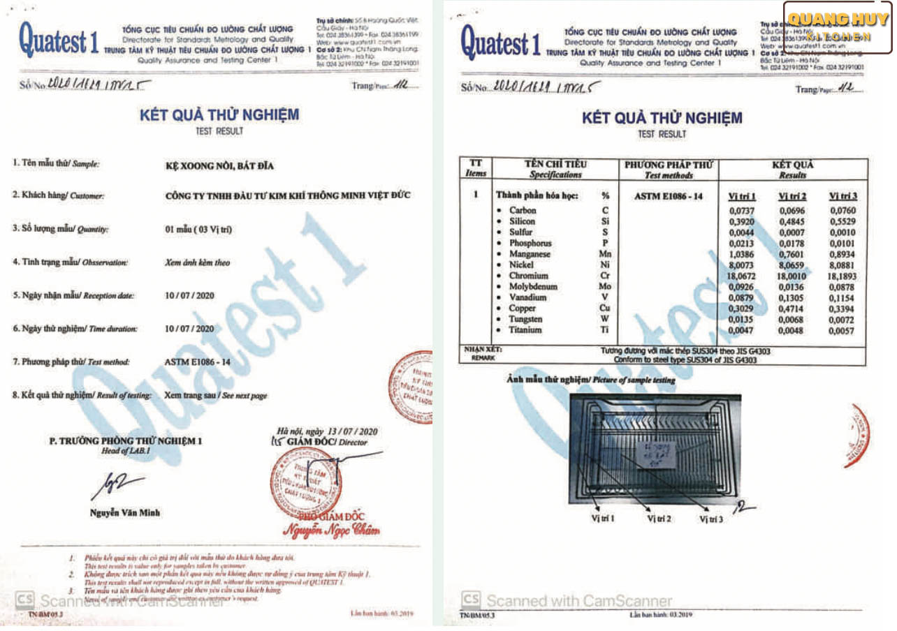 Giấy chứng nhận inox 304 được tổng cục đo lường chất lượng kiểm đinh