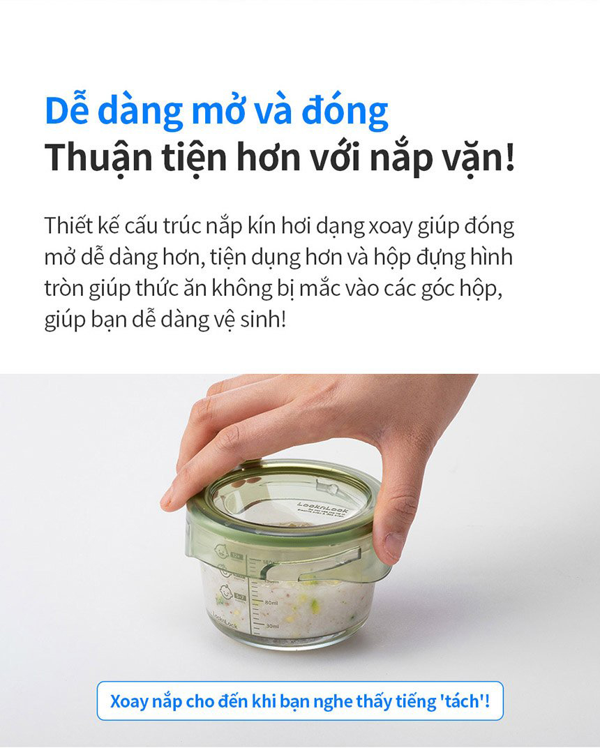 7. Đóng mở nắp dễ dàng với việc xoay nhẹ nắp cho đến khi nghe thấy tiếng "tách", không bị rò rỉ thức ăn và ngăn chặn được vi khuẩn xâm nhập