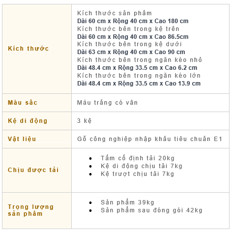 | Kích thước (Dài x Rộng x Cao) | 60 x 40 x 180 cm |
