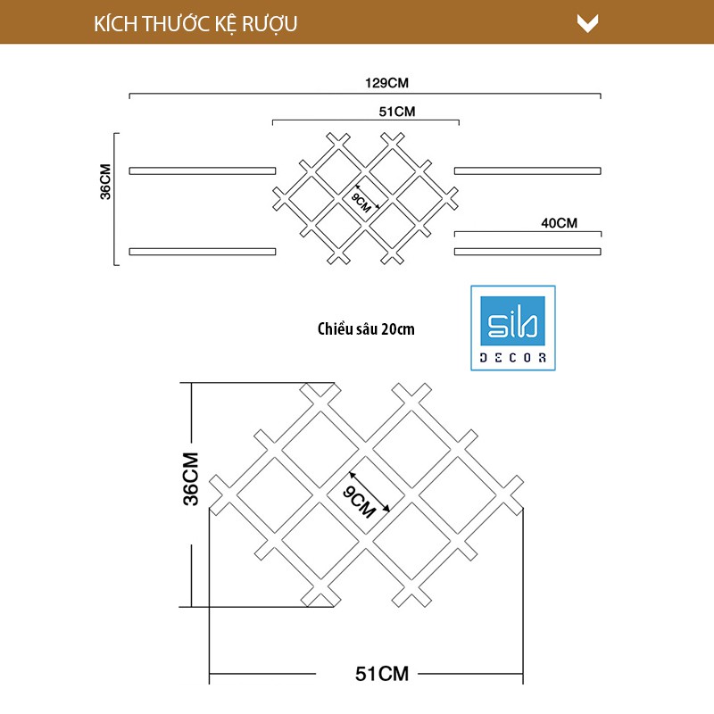 + Kích thước: tổng thể: 129cm x 36cm x 20cm (dài x cao x sâu). Gồm 4 thanh ngang 40x20cm, 1 khối để rượu 9 ngăn 51x36x20cm.