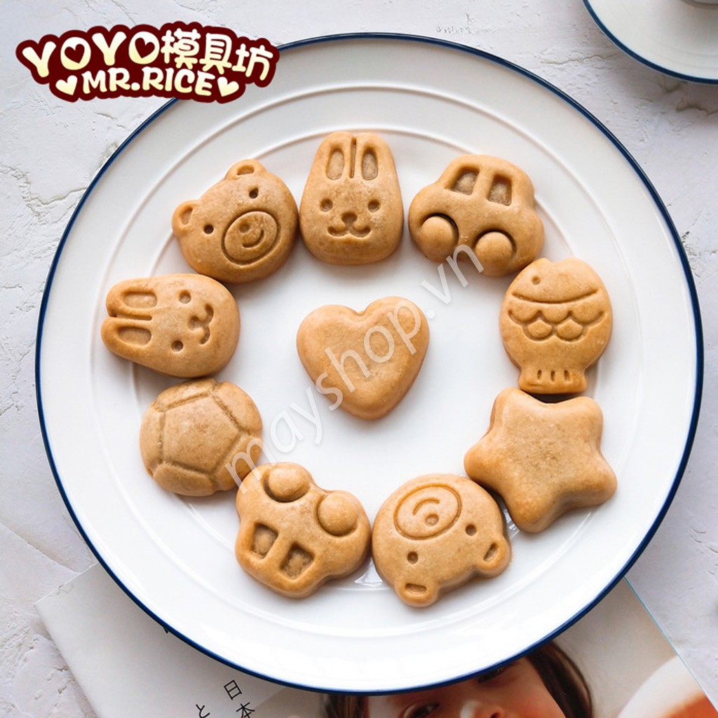 Sản phẩm gồm 8 hình: ô tô, gấu, thỏ, cá , trái tim, ngôi sao, doremon, doremi