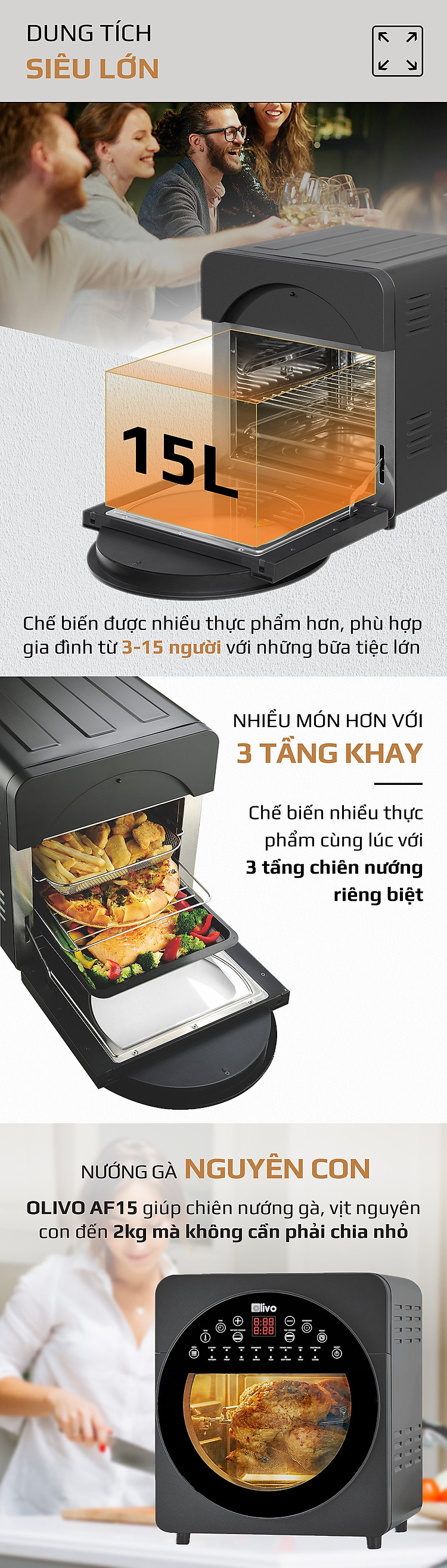 - OLIVO AF15 là một trong những nồi chiên không dầu có dung tích lớn nhất trên thị trường hiện nay lên tới 15L. Với không gian lòng nồi siêu rộng này bạn có thể thoải mái nướng gà nguyên con, vịt ngan nguyên con mà không cần phải chia nhỏ.