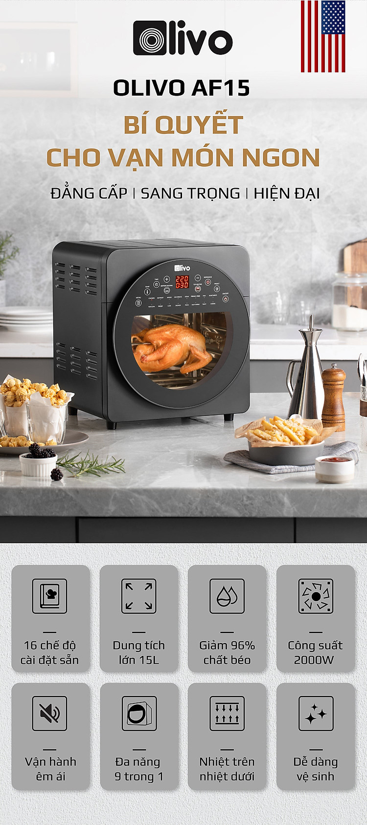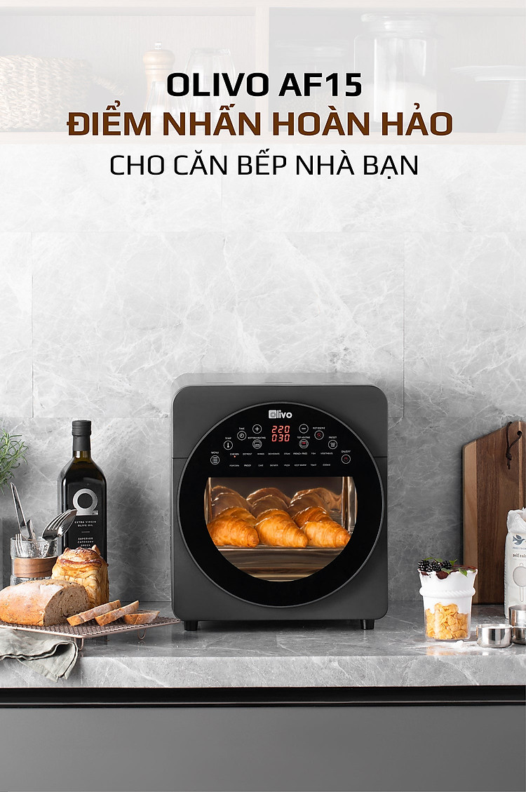 - OLIVO AF15 có thể được sử dụng thay thế các thiết bị nhà bếp khác như lò nướng, lò vi sóng, bếp nướng, máy sấy hoa quả, máy nướng bánh mì, máy làm bỏng ngô và máy làm sữa chua, nồi chiên sâu, máy làm bít tết.