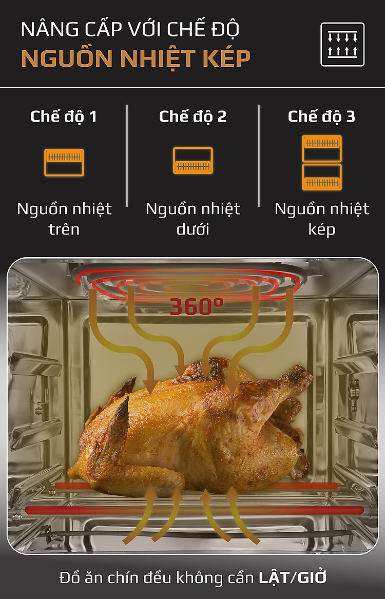 Dung tích siêu lớn và giá đỡ lưu thông không khí 3 lớp - Chiên gà, vịt nguyên con lên đến 2kg vô cùng dễ dàng và tiện lợi
