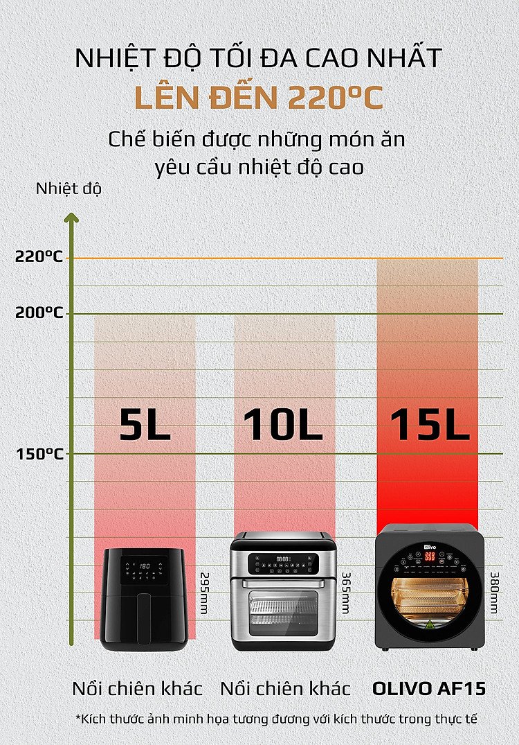 - Với dung tích khủng như vậy nhưng thiết kế OLIVO AF15 vẫn nhỏ gọn 329x320x380mm không cồng kềnh và không chiếm quá nhiều diện tích căn bếp của nhà bạn. Điều này giúp cho căn bếp của bạn được gọn gàng, ngăn nắp và đẹp hơn khi có OLIVO AF15. Với 3 cấp độ nấu cho phép bạn chuẩn bị bữa ăn với quy mô cho toàn gia đình