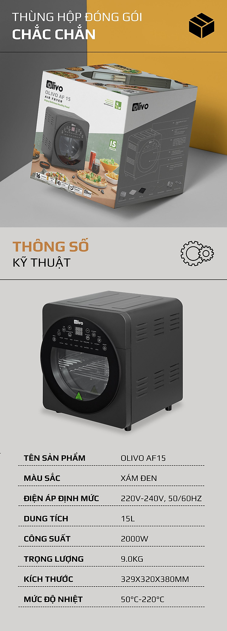 - Là một điểm hoàn hảo có thể làm xiêu lòng bất kỳ bà nội trợ nào kể cả những người khó tính nhất. Khi mua OLIVO AF15 bạn sẽ được sở hữu trọn bộ phụ kiện đa năng hỗ trợ chế biến món ăn đa dạng như: Lồng chiên, sách nấu ăn, sách hướng dẫn, đĩa xiên quay, khay hứng dầu, khay chiên, dụng cụ lấy đồ, nhông quay, vỉ nướng chống dính,