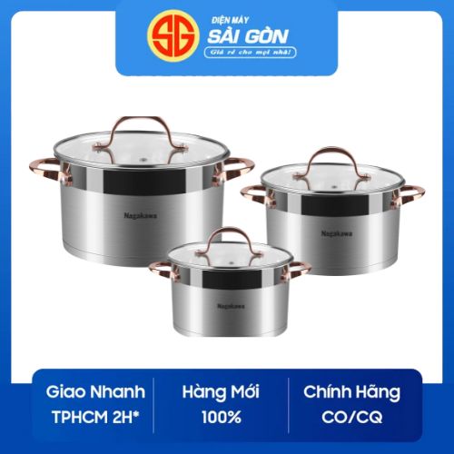 Bộ nồi inox Nagakawa NAG1352 bao gồm 3 nồi với 3 kích thước: 16 cm; 20 cm; 24 cm phù hợp với nhu cầu nấu nướng của mọi gia đình.