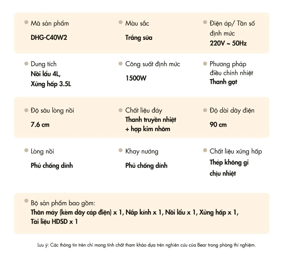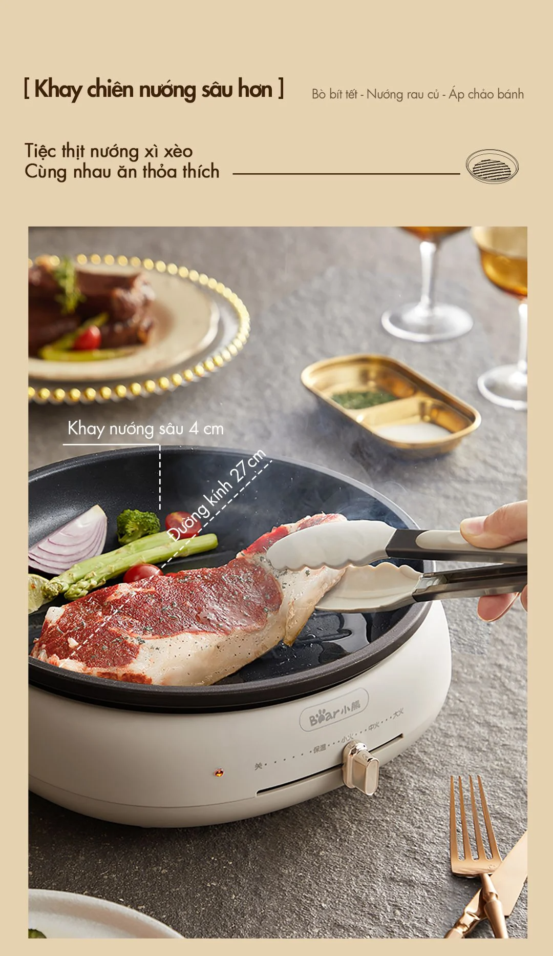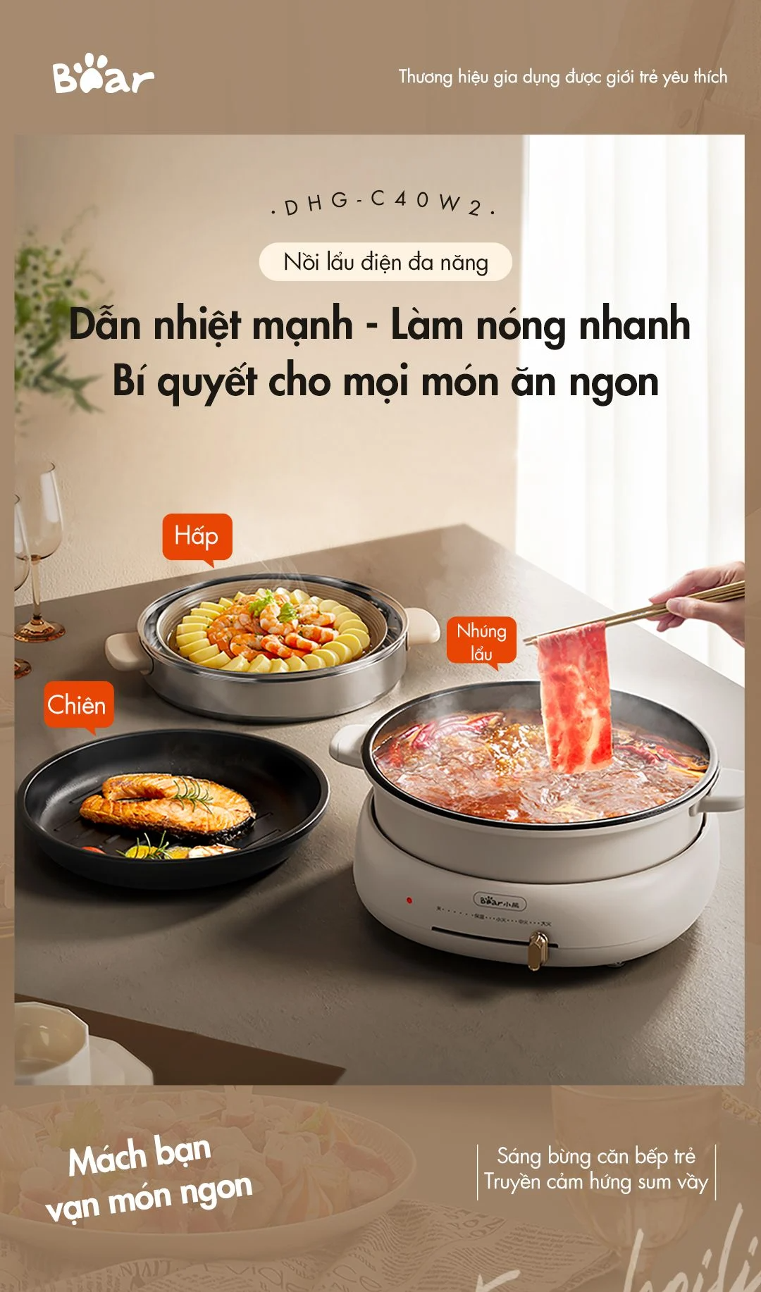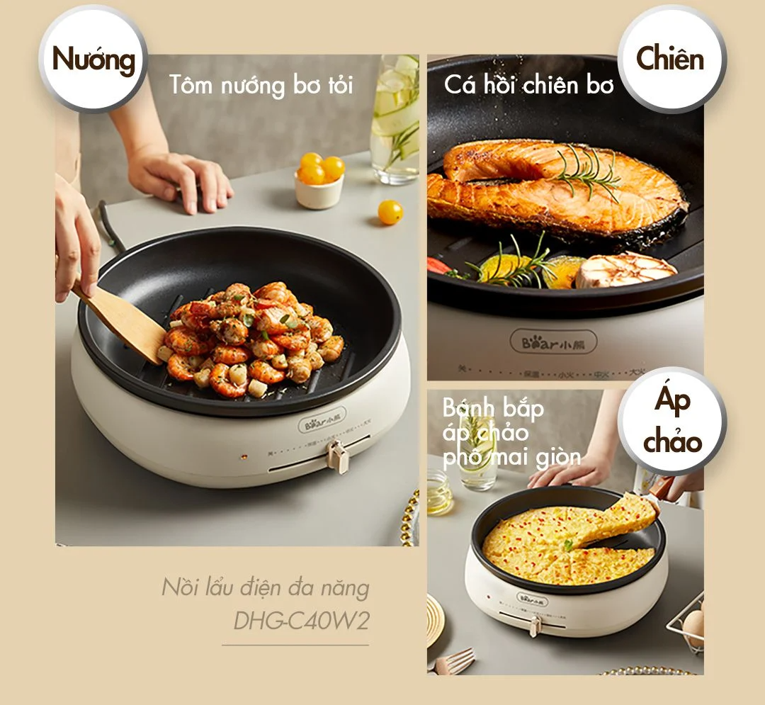 Nồi lẩu nướng đa năng DHG-C40W2 đã được nâng cấp với nhiều tính năng nổi trội hơn so với những phiên bản cũ, đặc biệt phù hợp với những gia đình từ 2-6 người. Bộ sản phẩm gồm đế điện kèm theo 1 nồi lẩu và 1 khay nướng đều phủ chống dính kèm 1 xửng hấp bằng chất liệu thép không gỉ chịu nhiệt đảm bảo an toàn cho sức khỏe người dùng.