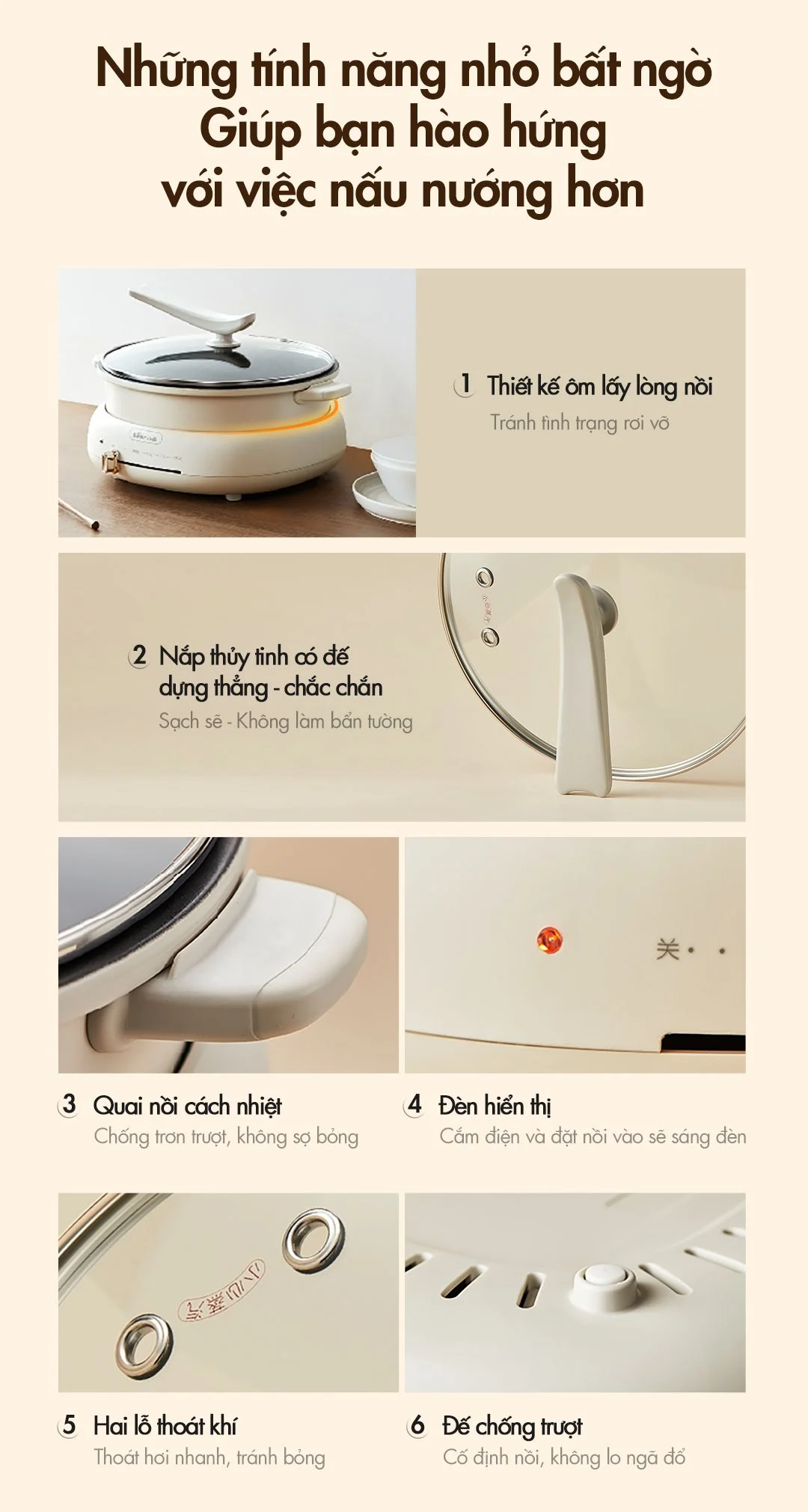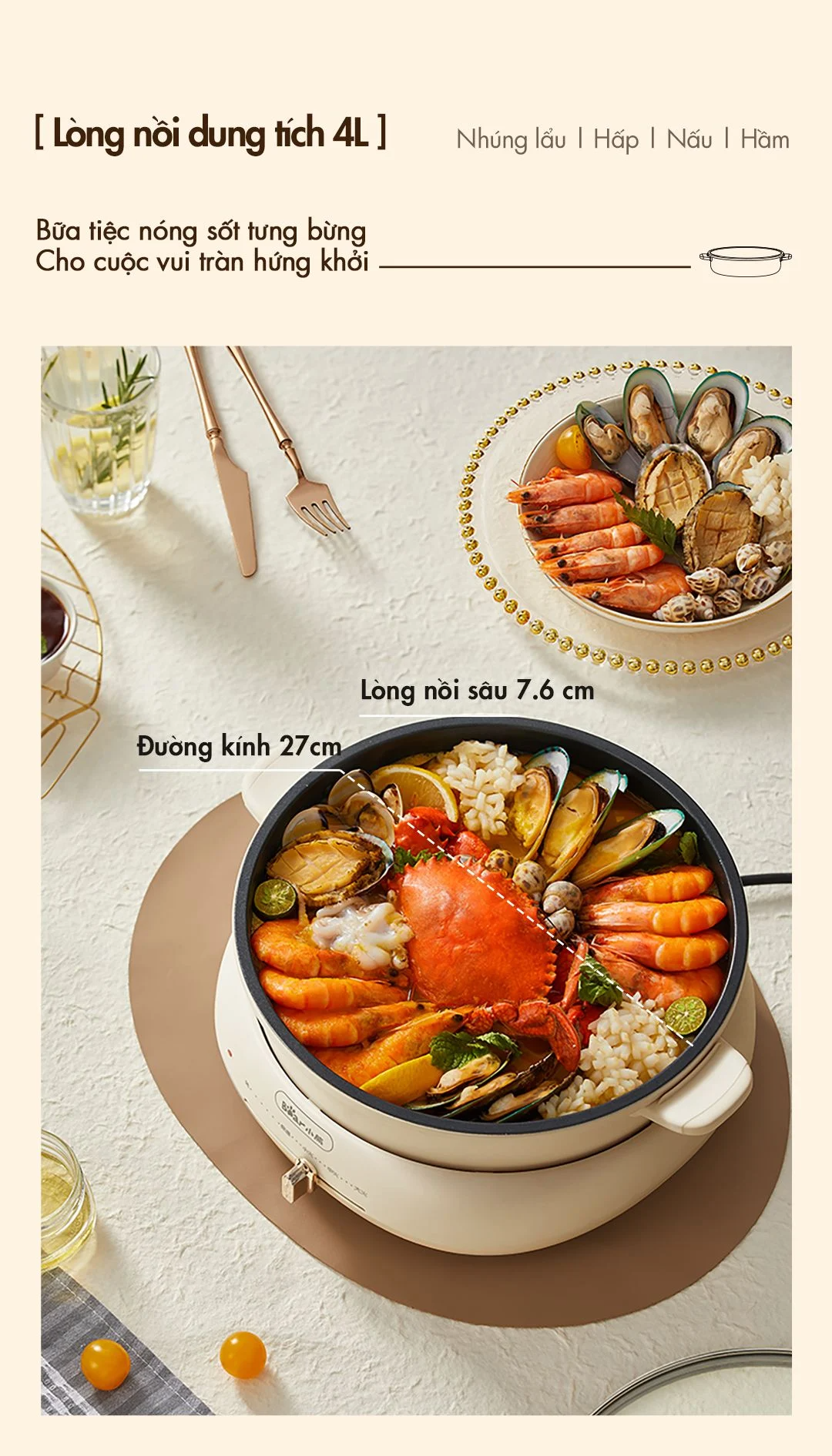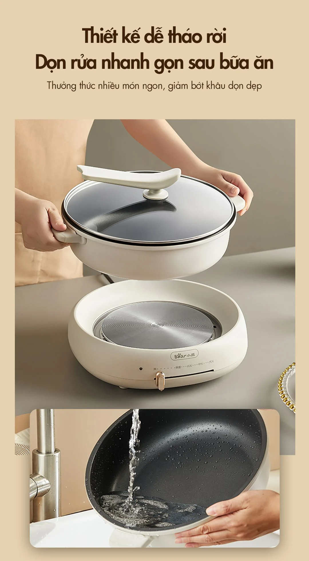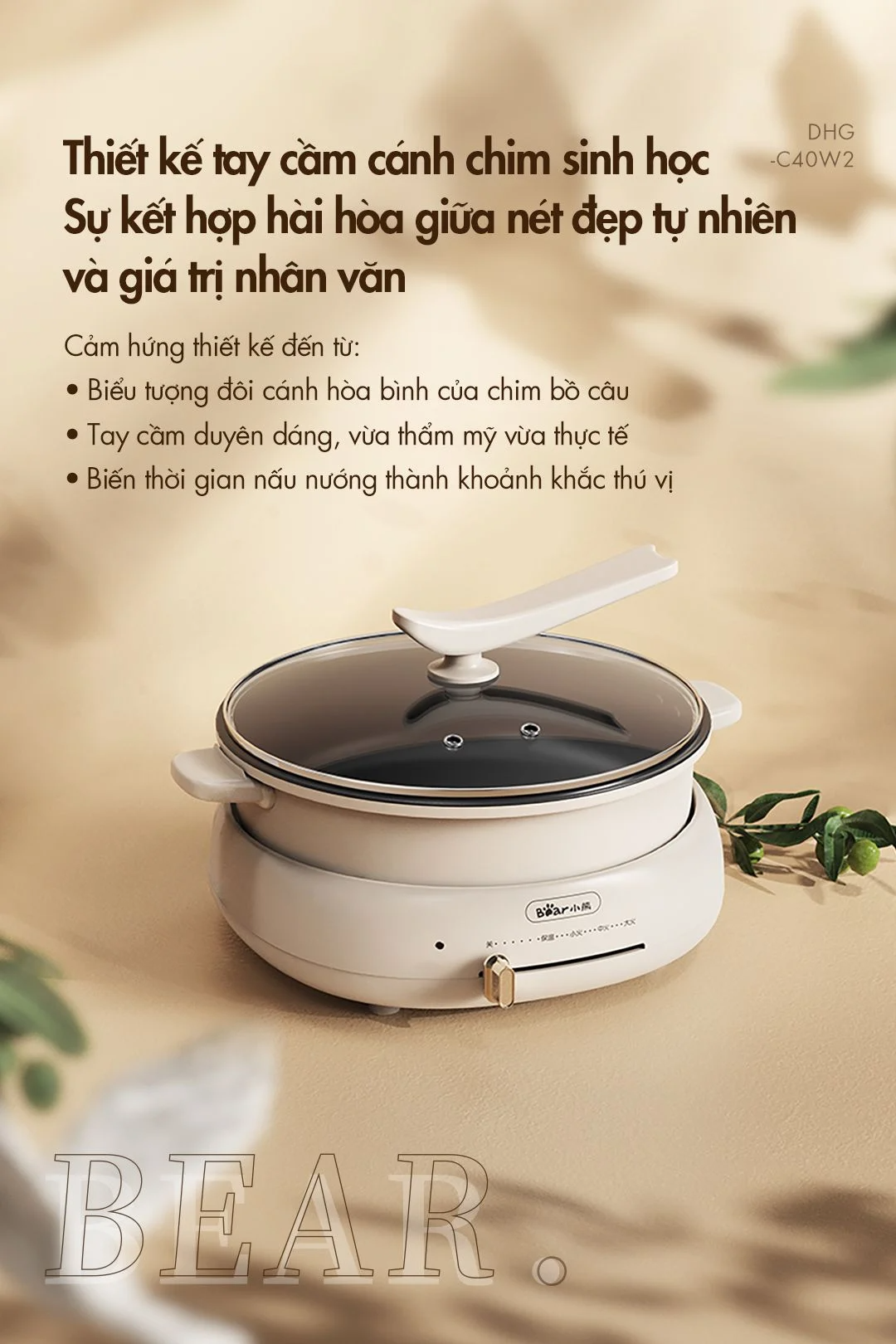Nồi lẩu nướng đa năng DHG-C40W2 đã được nâng cấp với đáy nhiệt vòng cung giúp dẫn nhiệt nhanh và đều hơn. Sản phẩm có màu trắng ngà đẹp mắt, kết hợp với các chi tiết mạ crom sáng bóng, tạo cảm giác sang trọng. Thiết kế lòng nồi và đế điện rời nhau giúp dễ dàng vệ sinh, ngoài ra người dùng còn có thể kết hợp lòng nồi với khay nướng và xửng hấp đi kèm để chế biến nhiều món, vừa tiện lợi lại vừa tiết kiệm thời gian nấu nướng.