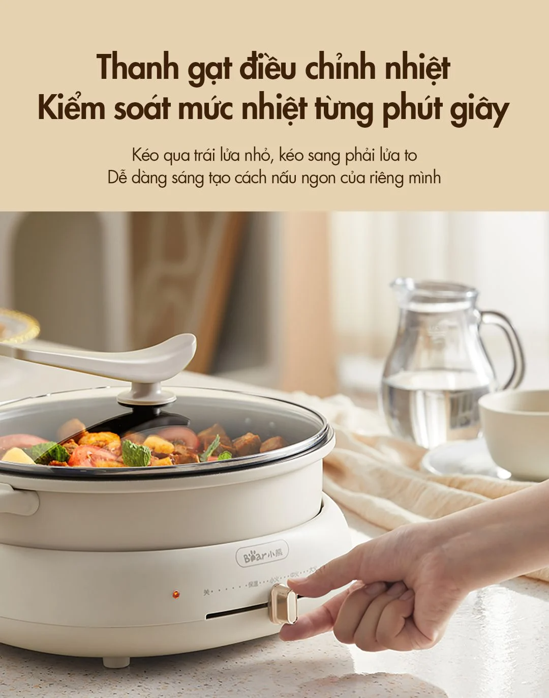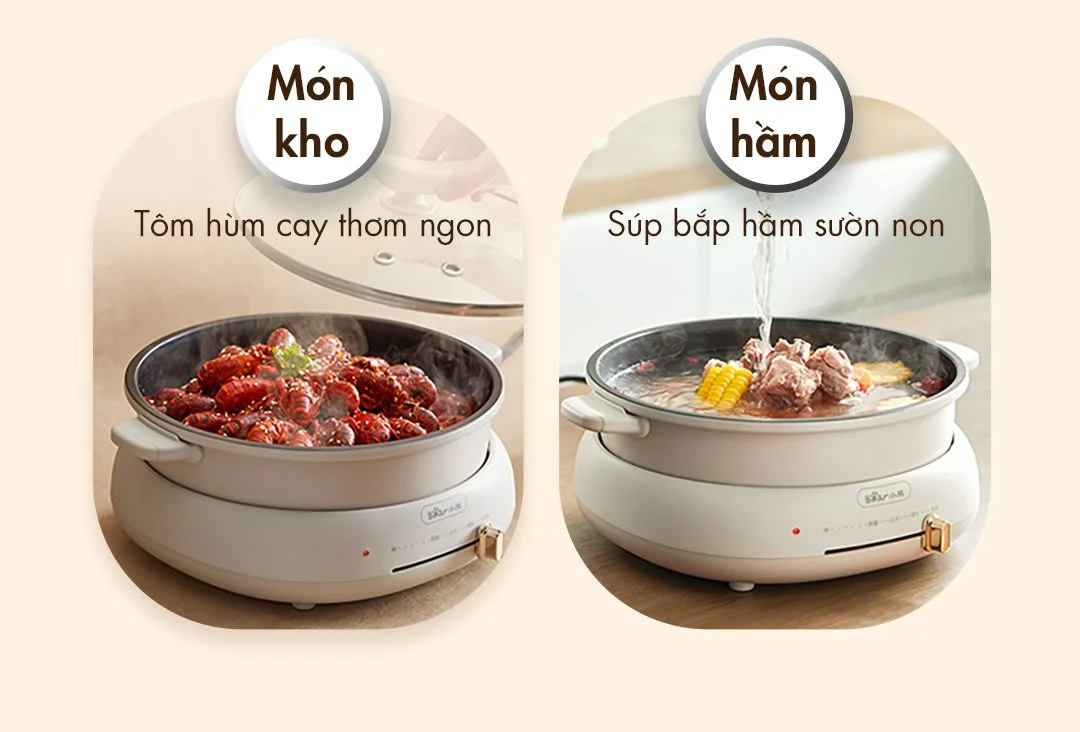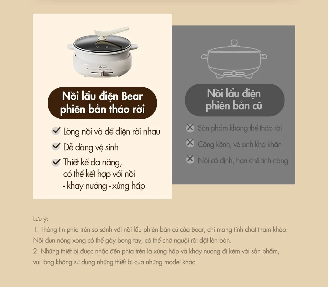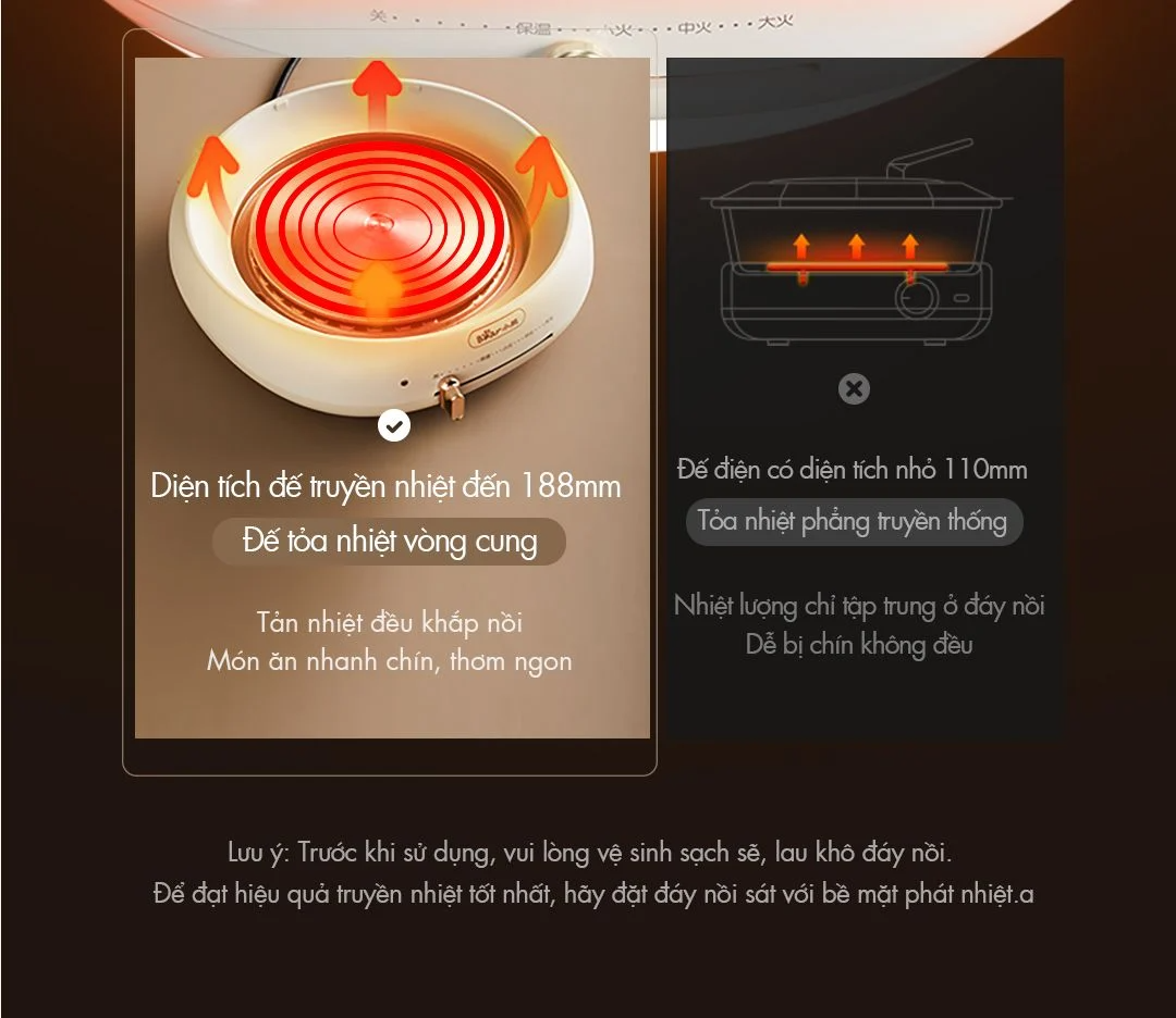 Nồi lẩu nướng đa năng DHG-C40W2 đã được nâng cấp với đáy nhiệt vòng cung giúp dẫn nhiệt nhanh và đều hơn. Sản phẩm có màu trắng ngà đẹp mắt, kết hợp với các chi tiết mạ crom sáng bóng, tạo cảm giác sang trọng. Thiết kế lòng nồi và đế điện rời nhau giúp dễ dàng vệ sinh, ngoài ra người dùng còn có thể kết hợp lòng nồi với khay nướng và xửng hấp đi kèm để chế biến nhiều món, vừa tiện lợi lại vừa tiết kiệm thời gian nấu nướng.